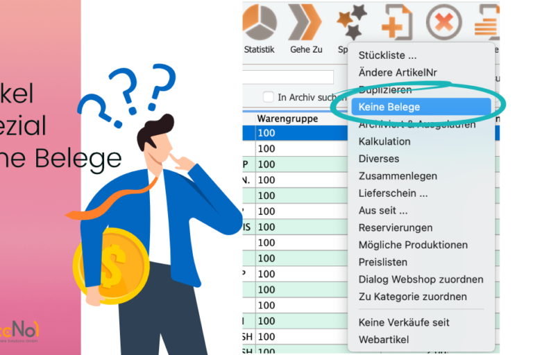 Keine Belege? Im Spezialmenü vom Artikel können Sie nach Artikeln ohne Belege filtern. Vergeben Sie ein Bis Datum und es werden alle Aufträge, Angebote, Bestellungen,…