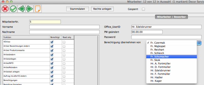 Sie können nun auf einfachste Weise bestehende Berechtigungen kopieren. Unter Stammdaten Mitarbeiter in die Berechtigungsverwaltung einsteigen und über ein PopUp Menü den User auswählen, von dem die Berechtigungen kopiert werden sollen. die kopierten Berechtigungen können dann natürlich verändert werden.