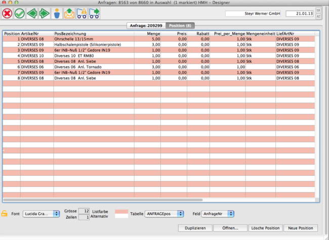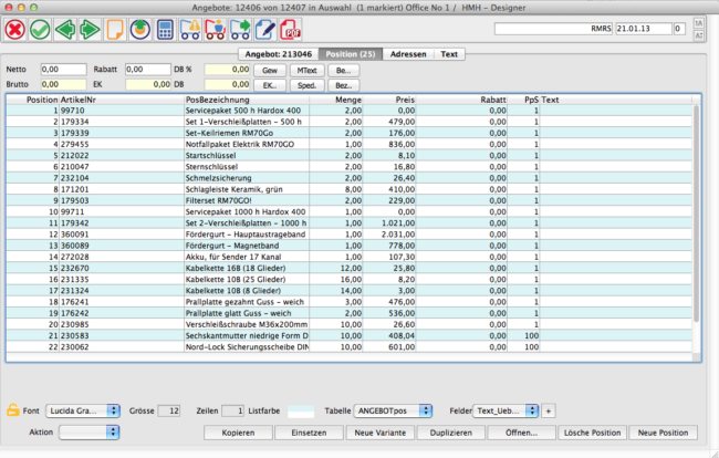 Die Umstellung der Belege auf variable Positionsdarstellung ist fast abgeschlossen. Diese umfassen jetzt:Angebot, Auftrag, Lieferschein, Rechnung, RahmenauftragAnfrage, Bestellung, Eingangsrechnung, RahmenbestellungBuchungsschein, Proformarechnung