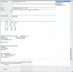 In OfficeV12 wurde das Senden von Belegen als PDF oder Textmail vollständig überarbeitet. In einem Dialogfenster werden nun folgende Ergänzungsmöglichkeiten geboten: Ändern und ergänzen der Empfängeradressen, dabei werden alle Mailadressen aus der OfficeNo1 Datenbank über eine Auswahlliste angeboten, die mit…