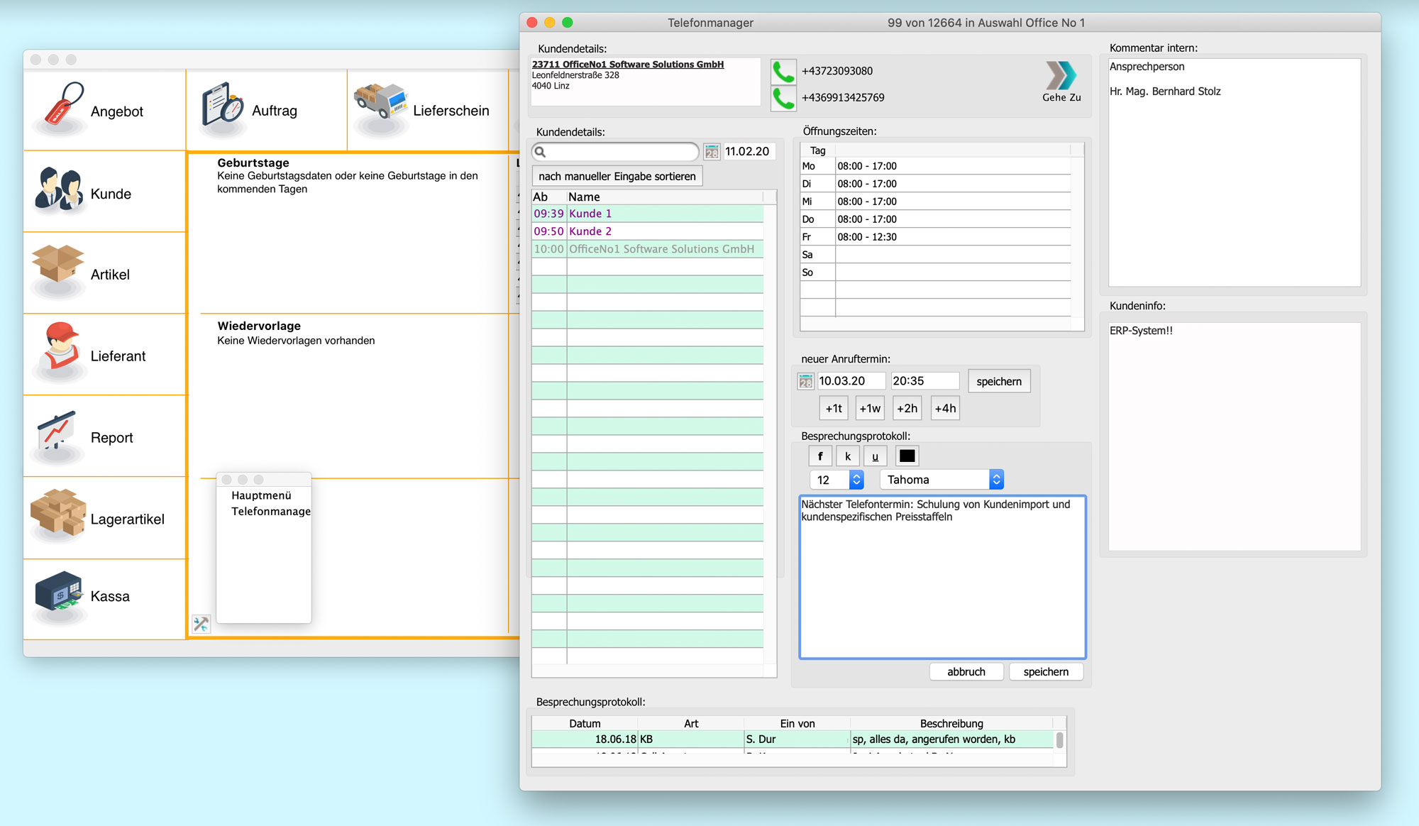 Sie haben eine Übersicht von allen zu tätigen Telefonaten, von dem Gesprächsprotokoll, für jeden Kunden die Telefonnummern, die Öffnungszeiten und den Informationstext. Telefonnummern, Öffnungszeiten und Informationstext werden im Stammblatt des Kunden hinterlegt.